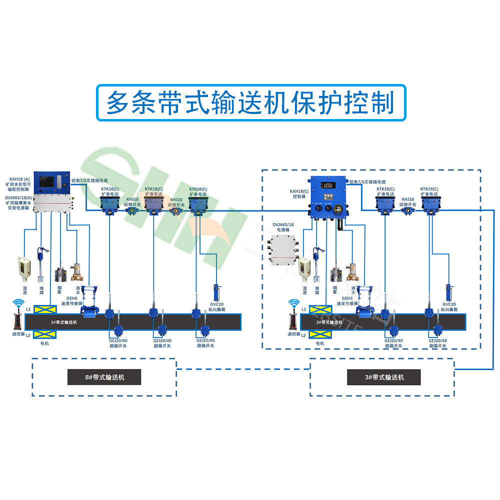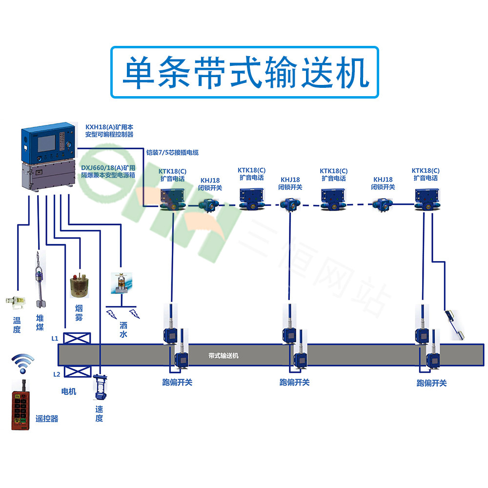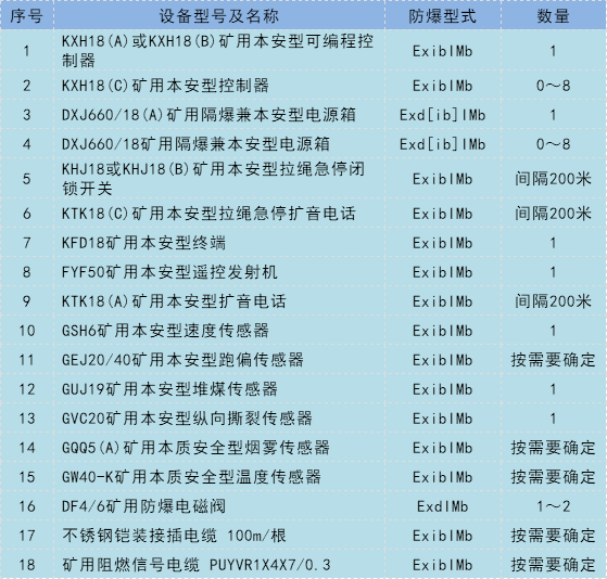 該裝置主要由KXH18(A)礦用本安型可編程控制器、KXH18(B)礦用本安型可編程控制器、KXH18(C)礦用本安型控制器、DXJ660/18礦用隔爆兼本安型電源箱、DXJ660/18(A)礦用隔爆兼本安型電源箱、KTK18(A)礦用本安型擴音電話、KTK18(C)礦用本安型拉繩急停擴音電話、KHJ18礦用本安型拉繩急停閉鎖開關、KHJ18(B)礦用本安型拉繩急停閉鎖開關、GUJ19礦用本安型堆煤傳感器、GEJ20/40礦用本安型跑偏開關、GVC20礦用本安型縱向撕裂傳感器、KFD18礦用本安型終端、FYF50礦用本安型遙控發(fā)射機、GSH6礦用本安型速度傳感器等設備組成。
