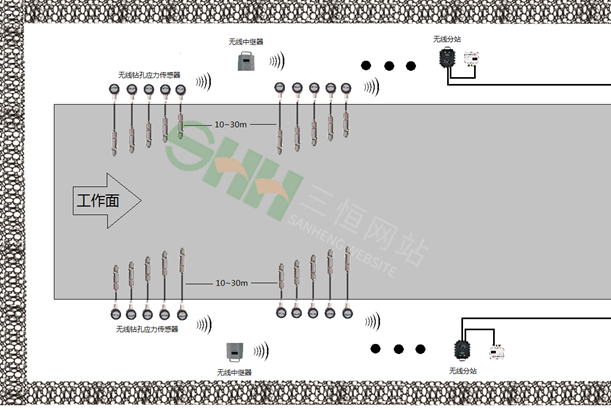 從超前應力區(qū)開始,在兩巷布置鉆孔應力測點,每組2-5個測點(6m、9m、12m、15m、18m),每隔10-30m安裝一組要求最少覆蓋200m長度區(qū)域,傳感器數(shù)據(jù)直接或者通過中繼器傳輸給采集分站。