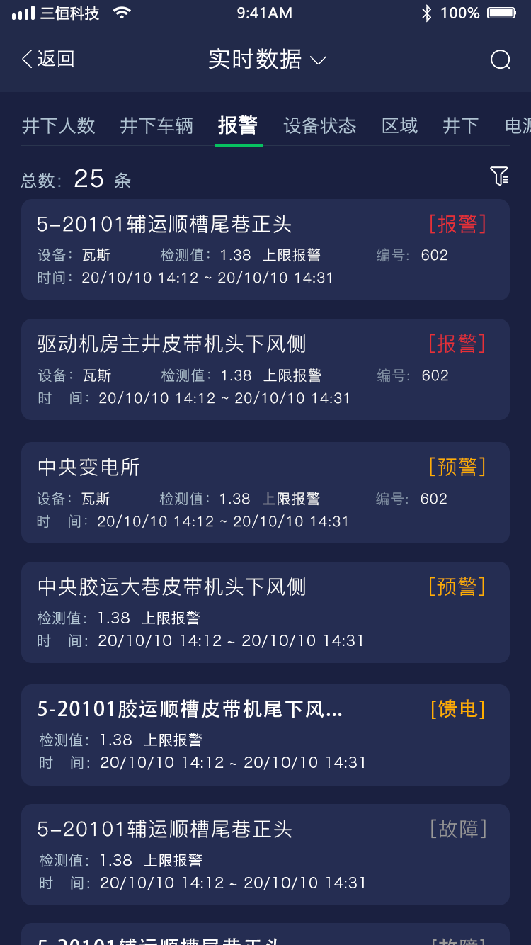 提供整個煤礦報警信息的統(tǒng)計及查看入口,如礦上有報警或者故障信息,會第一時間推送到用戶手機上。